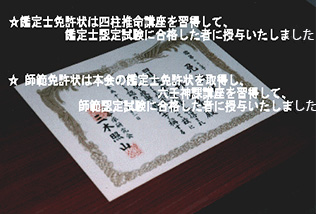 ☆鑑定士免許状は四柱推命講座を習得して鑑定士認定試験に合格した者に授与されました。